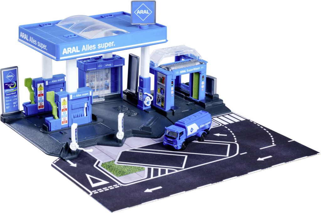 A Majorette ARAL benzinkútjánál autóid tankolhatnak a kútnál, feltölthetik elektromos árammal az elektromos töltőállomáson, vagy ragyogóan tisztára mosathatják magukat az autómosóban. A benzinkútnál dolgozók beszedik a fizetéseket és árulnak termékeket az üzletben. Számos kifinomult részlet, mint például az üzemanyag-szivattyúk és töltőállomások csatlakozásai vagy a mozgó autómosó, élethű játékélményt biztosít. És ha friss benzinre van szüksége, az Iveco Eurocargo tartálykocsi begördül – szabadonfutójával és fém karosszériájával turbóerős, és készen áll a segítségre bármilyen szűk keresztmetszetben.