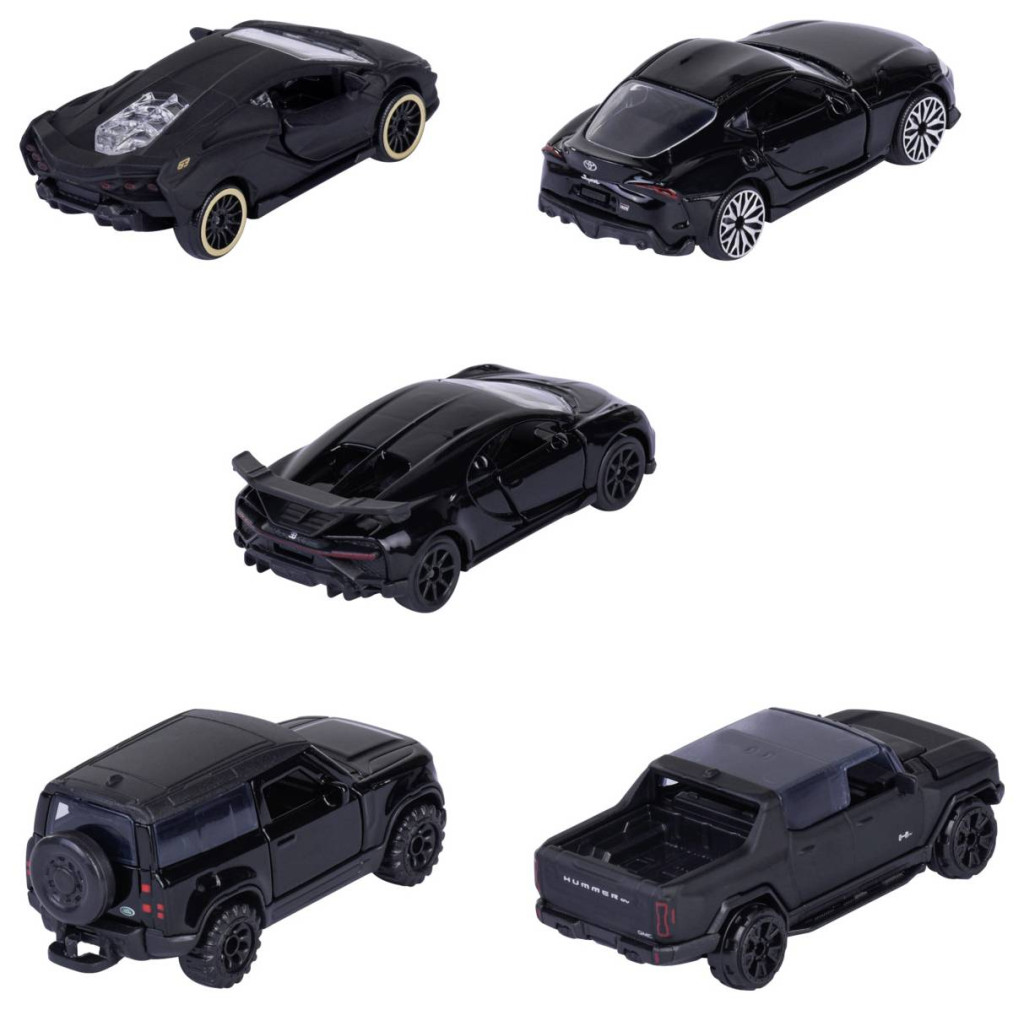 Majorette autószett fekete kiadás (5 autó) - 5 fekete fém modellautó szabadonfutó mechanizmussal, felfüggesztéssel és nyitható alkatrészekkel, játékautók gyűjtőknek és 3 éves vagy annál idősebb gyermekeknek, 7,5 cm mindegyik