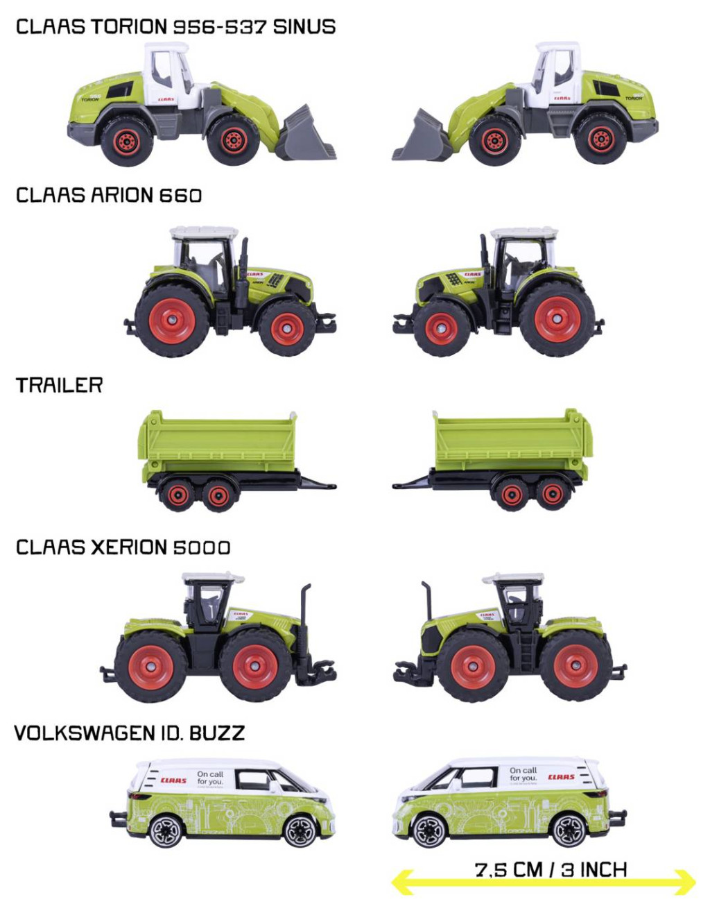 A Majorette Claas Farm készlet mozgást hoz minden játékfarmra, mert ezek a járművek tényleg munkába állhatnak! Két erős traktorral, pótkocsikkal együtt, egy sokoldalú kerekes rakodóval és egy ikonikus Volkswagen ID-vel. Buzz ajándékkészlete mindent tartalmaz, amire a 3 éves és annál idősebb kis gazdáknak szükségük van a farmkalandjaikhoz. A hivatalosan engedélyezett játékautók részletes specifikációkkal vannak ellátva, masszív fém karosszériával rendelkeznek, és szabadonfutó, valamint felfüggesztésüknek köszönhetően könnyedén gurulnak mezőkön, udvarokon és gyerekszobák padlóján.