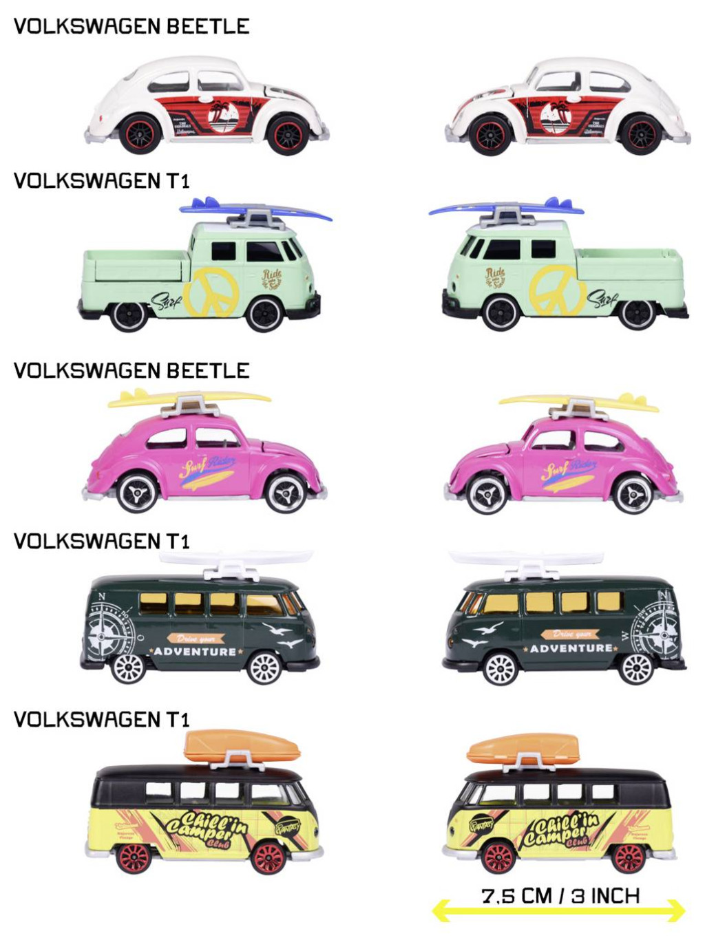 Majorette Volkswagen autókészlet (5 autó) – 5 fém modellautó szabadonfutó mozgással, felfüggesztéssel és kiegészítőkkel, beleértve 2 exkluzív modellt, játékautók gyűjtőknek és 3 éves vagy annál idősebb gyermekeknek, mindegyik 7,5 cm magas