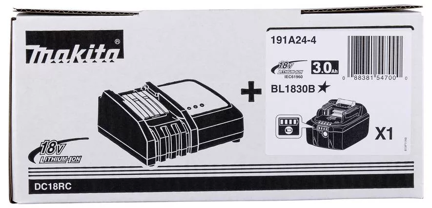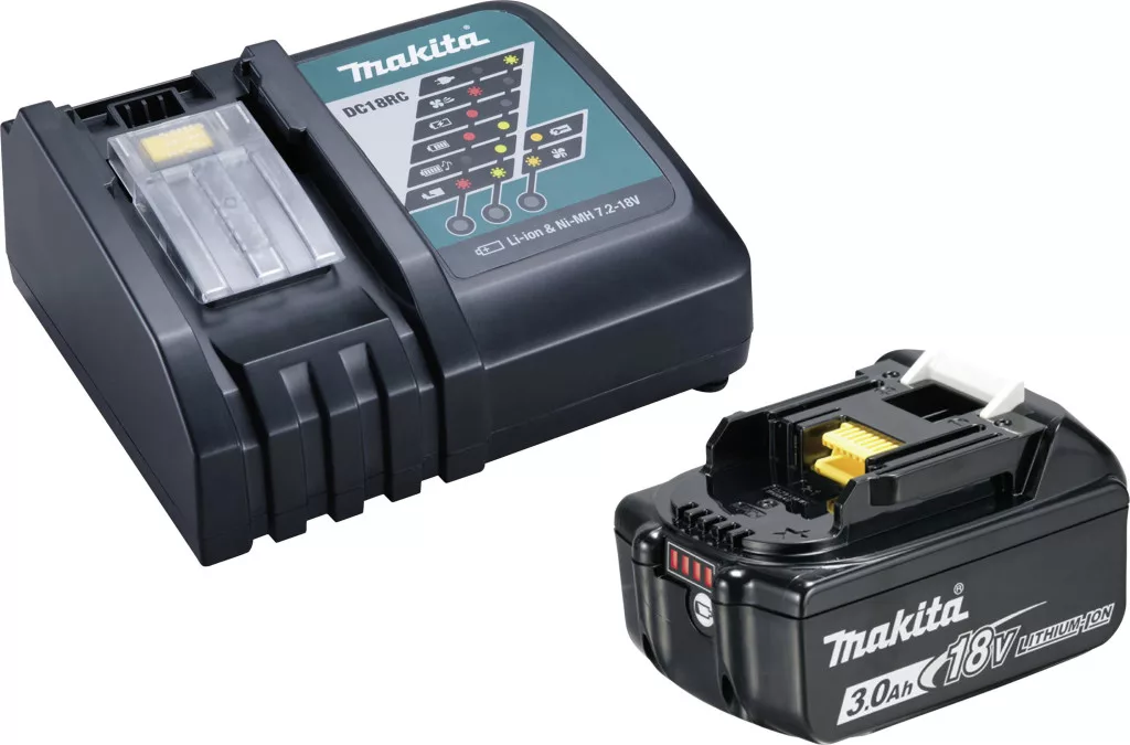 Áramforrás-készlet, amely 1 db BL1830B 3,0 Ah akkumulátorból és 1 db DC18RC gyorstöltőből áll. Dobozban szállítjuk.