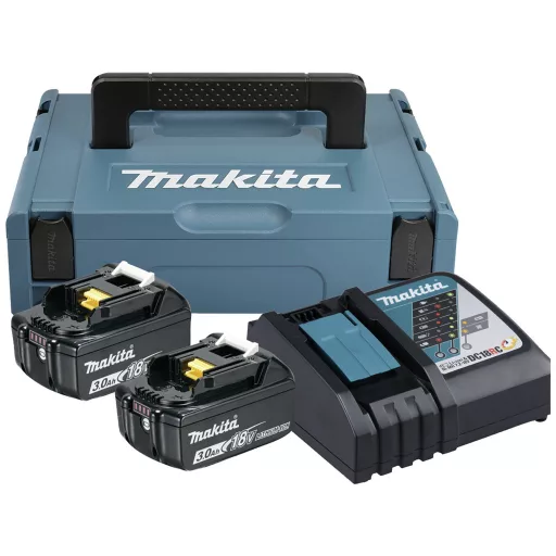 Áramforrás készlet, amely 2 db BL1830B 3.0 Ah akkumulátort és 1 db DC18RC gyorstöltőt tartalmaz. MAKPAC 1-es méretben szállítjuk.