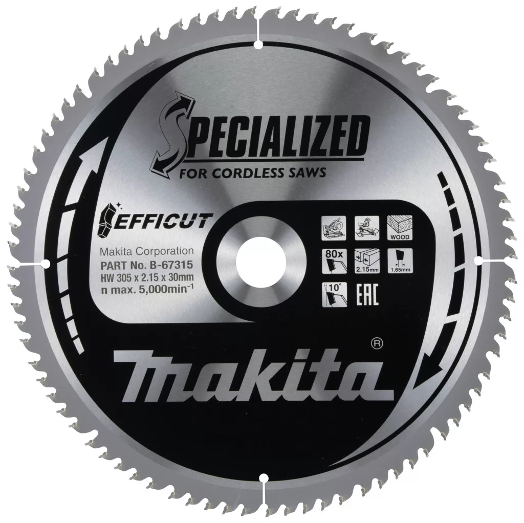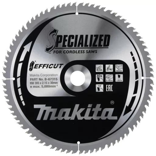 Műszaki adatok: Fog forma: Efficut · Fogak száma (collonként): 80 · Furat átmérő: 30 mm · További műszaki adatok: Fogszög: 10° · Vastagság: 2.15 mm · Átmérő: 305 mm