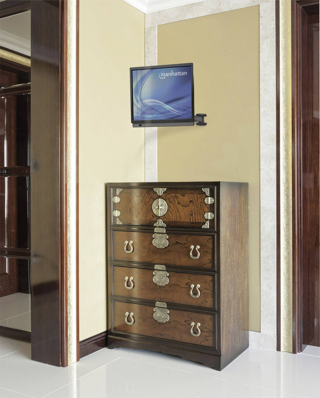 A Manhattan univerzális TV-tartója maximális kényelmet és szabad mozgást biztosít a TV-készülék falra szereléséhez. A gázrugónak köszönhetően bármikor könnyen beállíthatja a magasságot - elég könnyű megérinteni. Az integrált gömbcsuklónak köszönhetően a teljes billentés és elfordulás lehetséges. A VESA-megfelelőség és a minőségi anyag segítségével a szerelvény széles íves és síkképernyős méretek széles skálájára alkalmas, és 30 kg-os teherbírással megbízható földfelszíni rögzítést biztosít.
