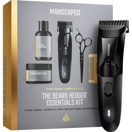 MANSCAPED® The Beard Hedger™ Essentials Kit: Elemmel működő SkinSafe™ szakállvágóval, szakállsamponnal és -balzsammal, fésűvel és ollóval, ajándékkészlettel, valamint minden az egyben borotválkozókészlettel