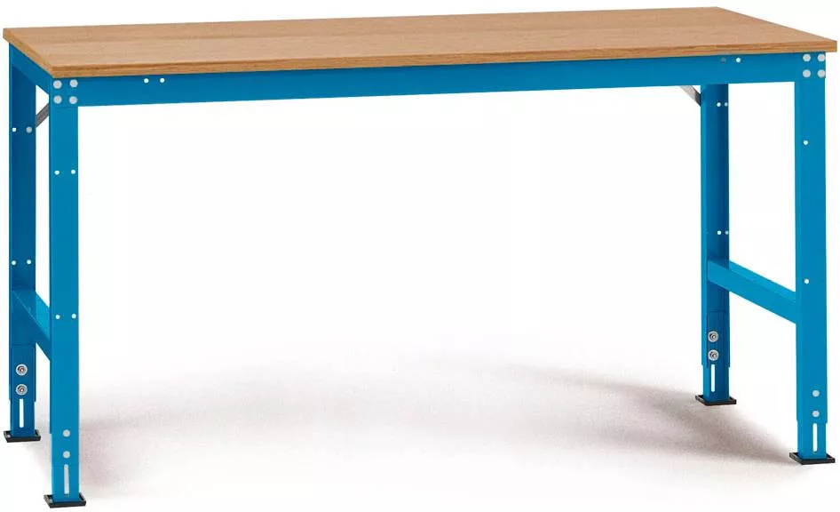 Az UNIVERSAL Standard munkaasztal világoskék RAL 5012, 1750 mm széles és 1200 mm mélyen rendkívül stabil és tartós az önhordó acélkeretnek köszönhetően. Ideális bármilyen alkalmazáshoz, akár egy-, akár soros munkaasztalként, vagy a kiegészítők széles választéka miatt, teljesen felszerelt összeszerelő vagy teszt munkahelyként. Az UNIVERSAL Standard munkaasztal teleszkópos szorítócsavarjának magasságát 738-848 mm-rel állítják, plusz az asztallap vastagsága különböző munkamagasságokhoz ülve és állva. A rendkívül magas, 700 kg-os teherbírás miatt (egyenletes rakományelosztás mellett) az asztal ideális nagy gyártási vagy összeszerelési mechanikai terhelésekhez. Az önhordó keret 2 acélprofilból áll, 50 x 40 mm-es és 2 stabil, 60 mm magas keretről, valamint gumicsizmából (6 mm) a padlóburkolat védelmére. A keret kiváló minőségű, porréteggel bevont, világoskék RAL 5012 színű. A 22 mm vastag, 1750 mm széles és 1200 mm mélységű olajozott multiplex asztallap I / III minőségű bükk többrétegű táblából áll, a DIN 68705 2. része szerint. A multiplex asztallap nagy nyomás alatt, DIN 68705 IF (IW67) szerint keresztragasztva, vízálló és környezetbarát módon van olajozva. Minden él és sarok meg van őrölve és lemetszett. Igény szerint lehetséges a multiplex lemez tiszta bevonása. A multiplex asztallapot mindenütt használják, ahol nagy mechanikai terhelésekre van szükség, például az összeszerelési és gyártási területen. A ragasztás miatt az asztallap nedves anyagokkal történő alkalmi munkákhoz is használható. Az UNIVERSAL Standard munkaasztal bármikor és határozatlan időre kibővíthető kiegészítő kiegészítő táblákkal egy sor munkaállomás létrehozásához (UNIVERSAL Standard kiegészítő asztal termékszám: AU6105.5012).