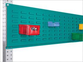 Az összes UNIVERSAL munkaasztalhoz és a PROFI munkapadhoz készült réselt szerszámlemez a nyitott elülső tárolóedények rögzítéséhez használható tartócsavarral vagy horoggal elérhető, így optimalizálja a kis alkatrészekhez, szerszámokhoz és egyéb anyagokhoz való hozzáférést. Ez növeli a munkavállalók munkateljesítményét is. A szerszámréses lemezt az UNIVERSAL és a PROFI acél rögzítő portálokhoz kell rögzíteni. A sajtoló rés lemez 50 mm résmérettel rendelkezik. A réselt lemezek 22 mm-es rácsban vannak elrendezve. A réselt lemez acéllemezből készül, teljes szélessége 1996 mm, teljes mélysége 24,5 mm és teljes magassága 350 mm. A használható magasság 300 mm. A hasított sajtolólemez kiváló minőségű, porcel bevonva, RAL 5021 vízkékben.
