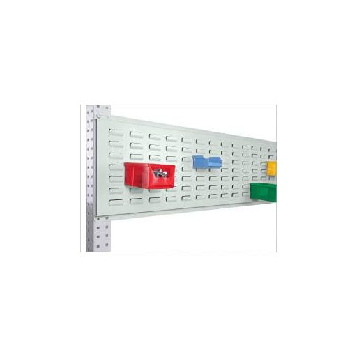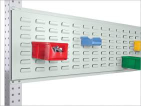 Az összes UNIVERSAL munkaasztalhoz és a PROFI munkapadhoz készült réselt szerszámlemez a nyitott elülső tárolóedények rögzítéséhez használható tartócsavarral vagy horoggal elérhető, így optimalizálja a kis alkatrészekhez, szerszámokhoz és egyéb anyagokhoz való hozzáférést. Ez növeli a munkavállalók munkateljesítményét is. A szerszámréses lemezt az UNIVERSAL és a PROFI acél rögzítő portálokhoz kell rögzíteni. A sajtoló rés lemez 50 mm résmérettel rendelkezik. A réselt lemezek 22 mm-es rácsban vannak elrendezve. A réselt lemez acéllemezből készül, teljes szélessége 1996 mm, teljes mélysége 24,5 mm és teljes magassága 350 mm. A használható magasság 300 mm. A hasított sajtolólemez kiváló minőségű, porréteggel bevont, világosszürke RAL 7035 színű.