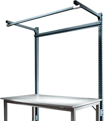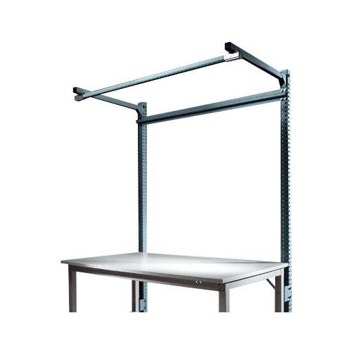 Az építési portálok csak egy teljesen kidolgozott munkahelyet dolgoznak fel a munkaasztalra. Használja az asztallap feletti munkaterületet szerszámok, eszközök vagy munkahelyi világítás céljából. Ez olyan egységet hoz létre, amely hatékonyan és ergonómiailag használható. Az 1500 mm hasznos magasságú és 2100 mm teljes magasságú felépítmény-portál használható minden UNIVERSAL + PROFI Standard munkaasztalon, amelynek asztalszélessége 1000 mm és asztalmélysége 800 mm. A teljes építési portál 2 építőoszlopból, kereszttartó támaszból, 2 sínhosszabbító karból és egy sín futópályából áll, amely szerszámok, eszközök vagy munkahelyi világítás rögzítésére szolgál. Az antracitból készült RAL 7016 kiváló minőségű, porcel bevonatú építőportál profil acélból készül, három oldalán perforálva, 30 mm-es rácsban. Szerkezeti elemek, például perforált panelek, hasított panelek, tárolókonzolok stb. Rögzítésére szolgál. Ezek magassága beállítható egy 30 mm-es rácsban. A felépítmény-portál 120 kg-os teherbírású lehet. A sínkeret mélysége 700 mm. 350 mm-es gémmélységnél a gém 40 kg-os teherbírással, 700 mm-es gémmélységgel és 25 kg-os teherbírású lehet. A felépítmény-portál használható magassága 1500 mm, alkatrész-szélessége 996 mm és mélysége 55 mm. Az egyes építőoszlopok szélessége 60 mm (méretek beleértve az asztalkerethez való rögzítéshez szükséges szerelvényeket). Az UNIVERSAL + PROFI Standard alapportál bármikor és határozatlan időre kibővíthető további szerelési portálokkal (UNIVERSAL + PROFI Standard termékportál: ZB3842.7016).