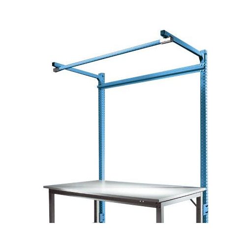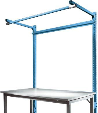 Az építési portálok csak egy teljesen kidolgozott munkahelyet dolgoznak fel a munkaasztalra. Használja az asztallap feletti munkaterületet szerszámok, eszközök vagy munkahelyi világítás céljából. Ez olyan egységet hoz létre, amely hatékonyan és ergonómiailag használható. Az 1500 mm használható magasságú és 2100 mm teljes magasságú kiegészítő portál minden UNIVERSAL + PROFI Standard munkaasztalon használható, 1000-es asztalszélességgel és 800 mm-es asztalmélységgel. A kiegészítő építési portál egy építőoszlopból, egy kereszttartó támaszból, egy sín tartóból és egy sín nyomtávból szerszámok, berendezések vagy munkahelyi világítás rögzítéséhez. A ragyogó kék RAL 5007 kiváló minőségű, porcel bevonatú, felületre szerelt portál profil acélból készül, három oldalán perforálva, 30 mm-es rácsban. Szerkezeti elemek, például perforált panelek, hasított panelek, tárolókonzolok stb. Rögzítésére szolgál. Ezek magassága beállítható egy 30 mm-es rácsban. A felépítmény-portál 120 kg-os teherbírású lehet. A sínkeret mélysége 700 mm. 350 mm-es gémmélységnél a gém 40 kg-os teherbírással, 700 mm-es gémmélységgel és 25 kg-os teherbírású lehet. A felépítmény-portál használható magassága 1500 mm, alkatrész-szélessége 996 mm és mélysége 55 mm. Az egyes építőoszlopok szélessége 60 mm (méretek beleértve az asztalkerethez való rögzítéshez szükséges szerelvényeket). Figyelem! Egy kiegészítő portálhoz szükség van egy alapportálra (alap portál: UNIVERSAL + PROFI Standard termékszám: ZB3841.5007).
