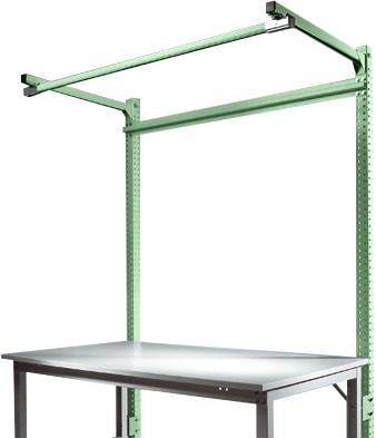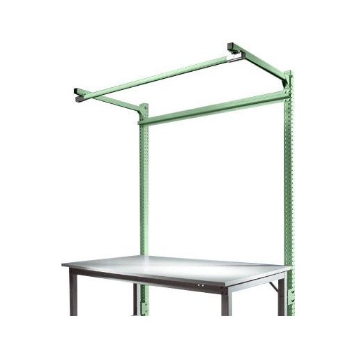 Az építési portálok csak egy teljesen kidolgozott munkahelyet dolgoznak fel a munkaasztalra. Használja az asztallap feletti munkaterületet szerszámok, eszközök vagy munkahelyi világítás céljából. Ez olyan egységet hoz létre, amely hatékonyan és ergonómiailag használható. Az 1500 mm hasznos magasságú és 2100 mm teljes magasságú felépítmény-portál használható minden UNIVERSAL + PROFI Spezial munkaasztalon, amelynek asztalszélessége 1000 mm és asztalmélysége 800 mm. A teljes építési portál 2 építőoszlopból, kereszttartó támaszból, 2 sínhosszabbító karból és egy sín futópályából áll, amely szerszámok, eszközök vagy munkahelyi világítás rögzítésére szolgál. A kiváló minőségű, porréteggel bevont építési portál zöld színű RAL 6011-es profil acélból készül, három oldalán perforálva, 30 mm-es rácsban. Szerkezeti elemek, például perforált panelek, hasított panelek, tárolókonzolok stb. Rögzítésére szolgál. Ezek magassága beállítható egy 30 mm-es rácsban. A felépítmény-portál 120 kg-os teherbírású lehet. A sínkeret mélysége 700 mm. 350 mm-es gémmélységnél a gém 40 kg-os teherbírással, 700 mm-es gémmélységgel és 25 kg-os teherbírású lehet. A felépítmény-portál használható magassága 1500 mm, alkatrész-szélessége 996 mm és mélysége 55 mm. Az egyes építőoszlopok szélessége 60 mm (méretek beleértve az asztalkerethez való rögzítéshez szükséges szerelvényeket). Az UNIVERSAL + PROFI speciális alapportál bármikor és határozatlan ideig bővíthető további szerelési portálokkal (UNIVERSAL + PROFI speciális termékportál: ZB3844.6011).