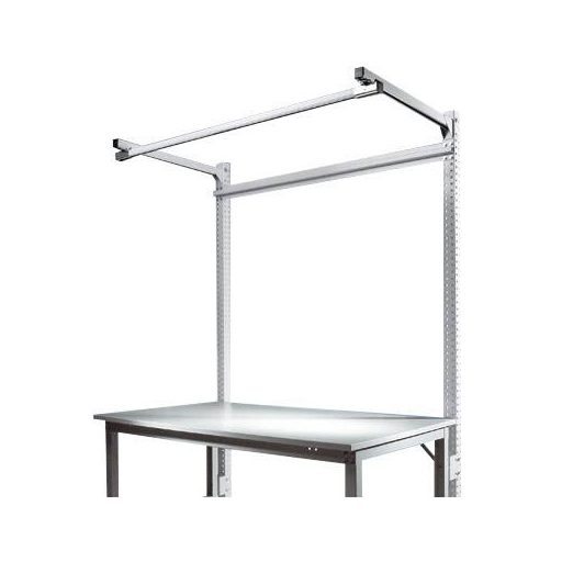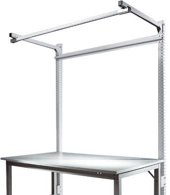 Az építési portálok csak egy teljesen kidolgozott munkahelyet dolgoznak fel a munkaasztalra. Használja az asztallap feletti munkaterületet szerszámok, eszközök vagy munkahelyi világítás céljából. Ez olyan egységet hoz létre, amely hatékonyan és ergonómiailag használható. Az 1500 mm hasznos magasságú és 2100 mm teljes magasságú felépítmény-portál használható minden UNIVERSAL + PROFI Spezial munkaasztalon, amelynek asztalszélessége 1000 mm és asztalmélysége 800 mm. A teljes építési portál 2 építőoszlopból, kereszttartó támaszból, 2 sínhosszabbító karból és egy sín futópályából áll, amely szerszámok, eszközök vagy munkahelyi világítás rögzítésére szolgál. A RAL 9006-hoz hasonló, kiváló minőségű, porcel bevonattal ellátott alumínium-ezüst szerkezet profil acélból készül, három oldalán perforálva, 30 mm-es rácsban. Szerkezeti elemek, például perforált panelek, hasított panelek, tárolókonzolok stb. Rögzítésére szolgál. Ezek magassága beállítható egy 30 mm-es rácsban. A felépítmény-portál 120 kg-os teherbírású lehet. A sínkeret mélysége 700 mm. 350 mm-es gémmélységnél a gém 40 kg-os teherbírással, 700 mm-es gémmélységgel és 25 kg-os teherbírású lehet. A felépítmény-portál használható magassága 1500 mm, alkatrész-szélessége 996 mm és mélysége 55 mm. Az egyes építőoszlopok szélessége 60 mm (méretek beleértve az asztalkerethez való rögzítéshez szükséges szerelvényeket). Az UNIVERSAL + PROFI speciális alapportál bármikor, korlátozás nélkül kibővíthető további szerelési portálokkal (UNIVERSAL + PROFI speciális termékportál: ZB3844.9006).