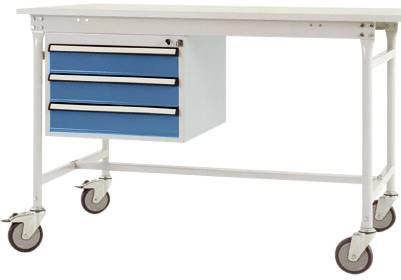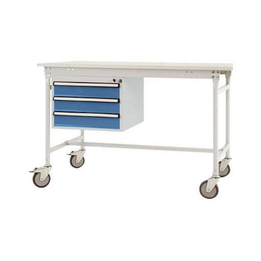 Hordozható háztartó, használható 3 fiókmagassággal, 3 mm-rel a HF0002 színkombinációval = a test világosszürke RAL 7035 és a fiókok ragyogó kék RAL 5007. Asztal mélysége 800 mm