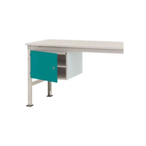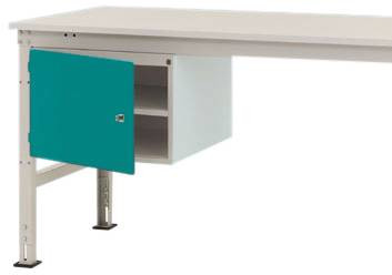 Komplett UNIVERSAL háztartás a munkaeszközök intelligens és tiszta szervezéséhez és tárolásához közvetlenül a munkahelyen, 500 mm szélességgel, 580 mm mélységgel és 360 mm magassággal. A ház szilárdan megerősített acéllemezből készül, kiváló minőségű porréteggel bevonva, RAL 5021 vízkékben. A ház minden UNIVERSAL munkaasztalhoz berakható 200 kg-ig (Ergo = 100 kg). A ház hengerzárral és 2 kulccsal van felszerelve. A ház használható rögzített UNIVERSAL munkaasztalokon, 800 mm asztalmélységgel. A ház használható magassága 300 mm, és egy ajtóból áll, rögzített polccal. UNIVERSAL Ergo munkaasztalok csak 1500 mm szélességű asztaloktól használhatók.