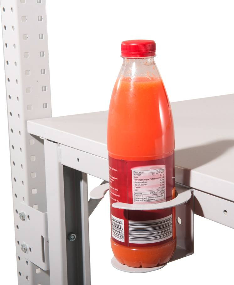 Gyakorlatilag gyakran kérdeztünk tőlünk. A palackok és az italzsák tartó. A tartó minden szabványos üveghez, kannához és italzsákhoz használható. Mivel a belső gyűrű átmérője 100 mm, négyzet alakú 1,5 literes palackok is befogadhatók. Ezenkívül a palacktartó könnyen elrendezhető italpoharakhoz is használható. Ha közvetlenül a munkaasztalhoz, munkapadhoz vagy a hozzá tartozó kiegészítő alkatrészekhez rögzíti, a munkafelület megszabadul az italos palackoktól, táskáktól vagy kannáitól, és így csak munka céljából áll rendelkezésre. Csökkent az ital vagy doboztartalom nem kívánt eloszlatásának kockázata is. Ezt a palacktartót csavarszerelvény segítségével kell rögzíteni, és ezért minden munkahelyen használható. A tartó acéllemezből készül és porszórt, világosszürke RAL 7035 színben.