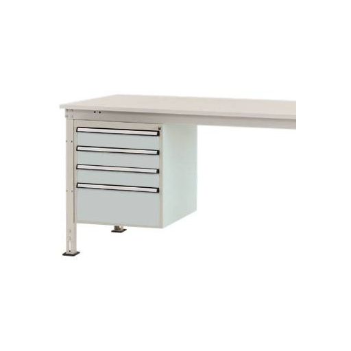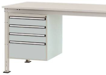 Komplett UNIVERSAL háztartás a munkaeszközök intelligens és tiszta szervezéséhez és tárolásához közvetlenül a munkahelyen, szélessége 500 mm, mélysége 580 mm és magassága 560 mm. A ház szilárdan megerősített acéllemezből készül, kiváló minőségű porréteggel bevonva, világosszürke RAL 7035 színben. A ház minden UNIVERSAL munkaasztalhoz berakható 200 kg-ig (Ergo = 100 kg). A ház hengerzárral és 2 kulcskal, valamint központi zárral van felszerelve. A ház használható rögzített UNIVERSAL munkaasztalokon, 800 mm asztalmélységgel. A ház használható felhasználható 500 mm magasságú, 4 fiókból áll, 3 x 100 és 1 x 200 mm magasságban. A fiókok 80% -ig kihúzhatók és 35 kg-ig is elférnek. A fiókok nagy fogantyúval és kiegészítő fiókkal vannak ellátva a fiókok címkézéséhez. A ház egyetlen kihúzható zárral van felszerelve. Ez megakadályozza több fiók akaratlan és egyidejű kinyílását, és így csökkenti az összetörés és a sérülés kockázatát. UNIVERSAL Ergo munkaasztalok csak 1500 mm szélességű asztaloktól használhatók.