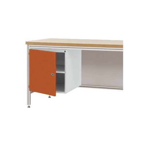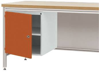 Teljes ház alap az ALU munkalaphoz. Intelligens és tiszta rend a munkahelyen, 500 mm szélesség, 580 mm mélység és 560 mm magasság mellett. A ház szilárdan megerősített acéllemezből készül, kiváló minőségű porbevonattal, vörös narancssárga színben, RAL 2001. A ház berakható az összes ALU munkaasztalhoz, 200 kg-ig. A ház 600 mm asztalmélységű ALU munkaasztalokon használható. A ház hengerzárral és 2 kulccsal van felszerelve. A ház használható magassága 500 mm, és egy bal oldali zsanéros ajtóból és egy rögzített polcból áll. Felhívjuk figyelmét, hogy minden asztalhoz csak egy ház alsó szerkezet csatlakoztatható.