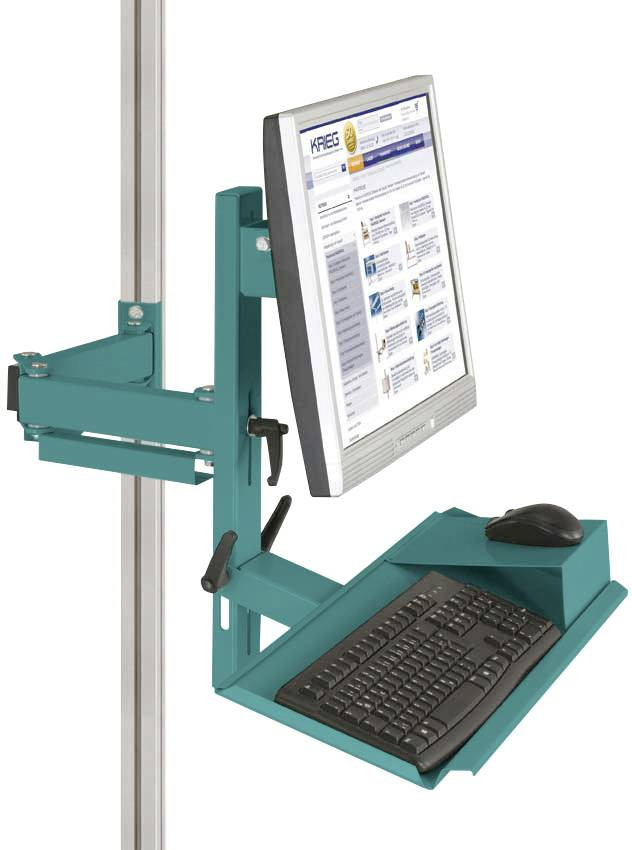 A CANTOLAB és az ALU munkaasztalok esetén ne pazarolja az időt az információkeresésre! A monitor támogatásával a dokumentumok közvetlenül láthatóak a munkahelyen. A billentyűzet és az egér felületén értékes időt lehet megtakarítani az elektronikus gyártási visszacsatolás révén. A 75 mm-es VESA csatlakozó adapterrel ellátott ergonómikus monitor-támogatást a lapos képernyők közvetlenül a munkahelyre történő rögzítésére használják. A tartórendszer ergonómiailag 3 különböző helyre, különböző méretű testre állítható. Az ergonómiai monitor támogatásával megvédi alkalmazottainak egészségét, ezáltal csökkentve a betegség és a távollétek számát. A teljes tartórendszer 81 mm-es tartományban, az Ergo monitor-tartó 56,3 mm-es tartományban, a billentyűzet tartó 81 mm-rel mozgatható. A hordozórendszer kiálló része 500 mm, teljes magassága 595 mm. A monitor alátámasztása 690 mm szélességű és 250 mm mélységű billentyűzettartó lapot tartalmaz. A szállítás egérfelületet is tartalmaz. A kábelvezetési csatornák a tartócsövek alá vannak beépítve, amelyek tiszta és rendezett munkaterületet biztosítanak. A monitor tartójának teherbírása 20 kg. Acélból készül és porfestékkel bevonva, kiváló minőségű vízkék RAL 5021-be.