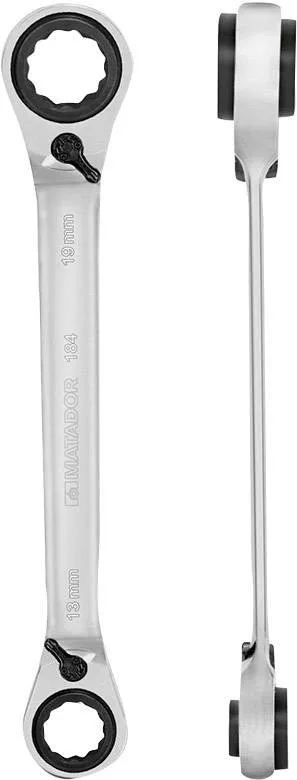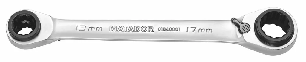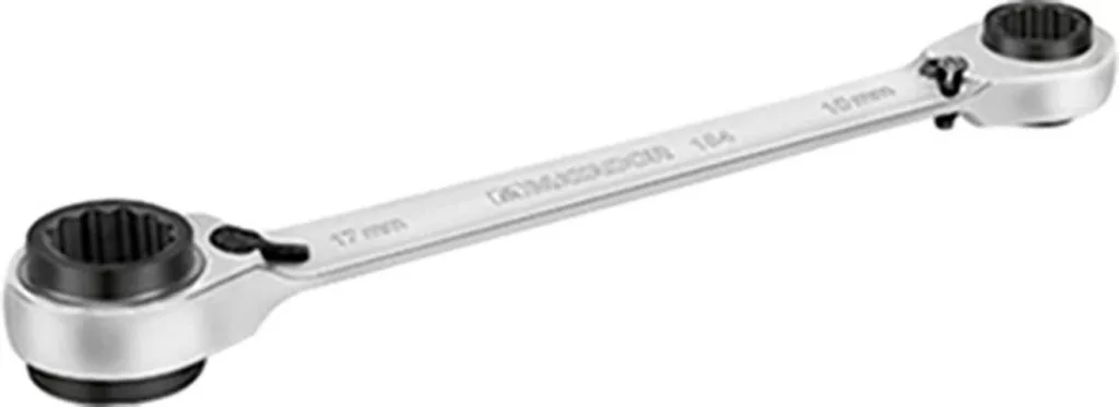 4 az 1-ben racsnis kulcs. 4 racsnis kulcs egy modellben, 10, 13, 17 és 19 mm kombinációja. Az összes csavarozási alkalmazás 70% -át lefedi. Szabadalmaztatott racsnisművel („Reverse Gear”), speciális acélból, 72 fogakkal. Nagyon magas nyomatékértékeket továbbít. A finom fogazásnak köszönhetően csak 5 ° -os elfordulási szög áll rendelkezésre - különösen zárt terekben. SmartDrive profillal, amely megvédi a csavarokat és az anyacsavarokat, mivel az erő a karimára, és nem a sarkokra kerül. Króm-vanádium acélból / matt krómozott. DIN 3110 / ISO 3318/1085/10102.