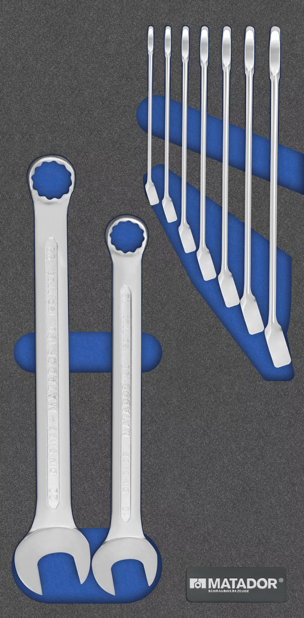 MTS-R / V (570x390 mm): Kombinált csavarkulcs, A forma. Két hangú MTS lágy habbetét 9 darabból. DIN 3113 A. kombinált villáskulcskészlet. Tartalom: 6 - 8 - 10 - 11 - 13 - 14 - 17 - 19 - 22 mm. Alkalmas RATIO és VARIO műhelykocsikhoz, üres modulokkal a QUADRO számára is.