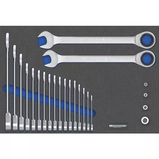 MTS-R / V (570x390 mm): kombinált racsnis kulcs. Kéttónusú MTS lágy habbetét 22 darabból. Kulcsos kulcs-készlet. Tartalom: 6 - 7 - 8 - 9 - 10 - 11 - 12 - 13 - 14 - 15 - 16 - 17 - 18 - 19 - 20 - 21 - 22 - 24 - 27 mm. Alkalmas RATIO és VARIO műhelykocsikhoz.