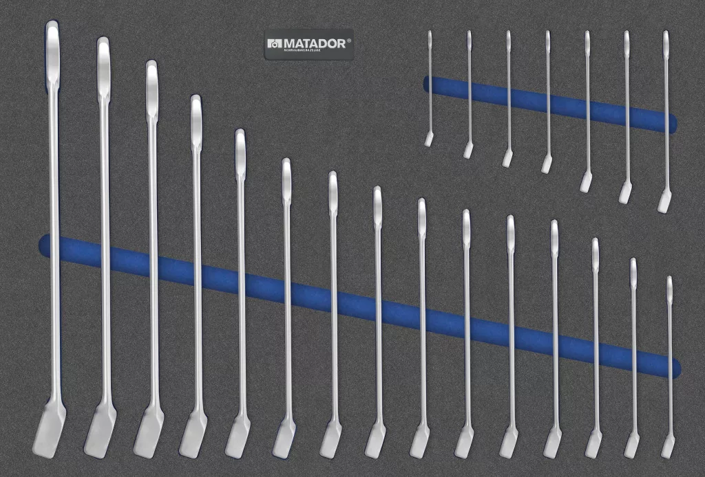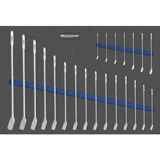 MTS-R / V (570x390 mm): kombinált csavarkulcs. Kéttónusú MTS lágy habbetét 22 darabból. DIN 3113 A. kombinált villáskulcskészlet. Tartalom: 6 - 7 - 8 - 9 - 10 - 11 - 12 - 13 - 14 - 15 - 16 - 17 - 18 - 19 - 20 - 21 - 22 - 24 - 27 - 30 - 32 - 34 mm. Alkalmas RATIO és VARIO műhelykocsikhoz.