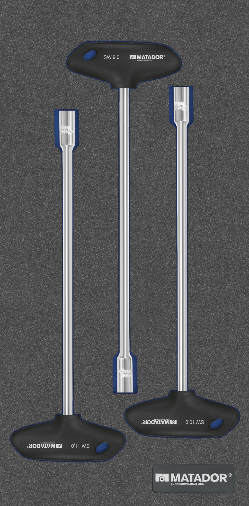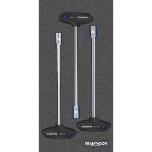 MTS-R / V (570x390mm): T-fogantyú-aljzatkulcs. Kétszínű MTS betét 3 darabmal. Hatszögletű kulcsok készlet. Alkalmas RATIO és VARIO műhelykocsikhoz, üres modulokkal a QUADRO számára is. Tartalom: 9-10-10 mm.