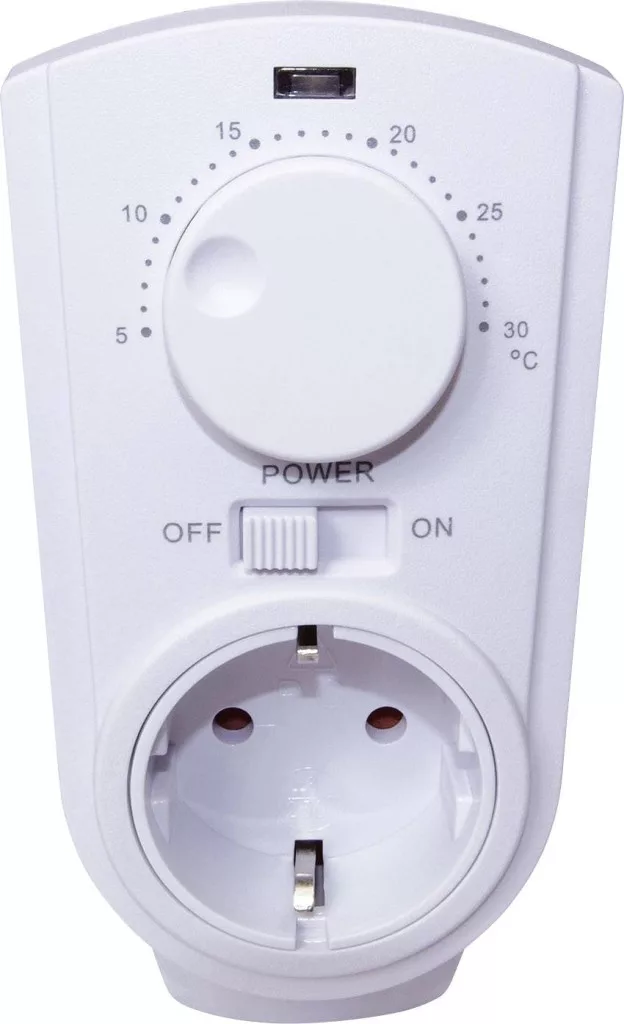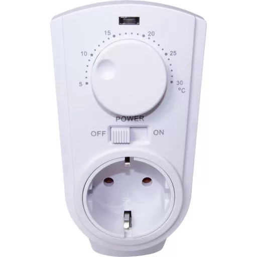 Hőmérséklet vezérelt Plug and Play dugaszolós termosztát a fűtő- és hűtő készülékek egyszerű megfigyelésére max. 3680 W-ig. Manuálisan, tekerőgombbal állítsa be a kívánt be- vagy kikapcsolási hőmérsékletet 5-30°C között. A mobil termosztátba beépített érzékelő figyeli a hőmérsékletet. Manuálisan a tolókapcsolóval kapcsolhatók be- illetve ki a készülékek.