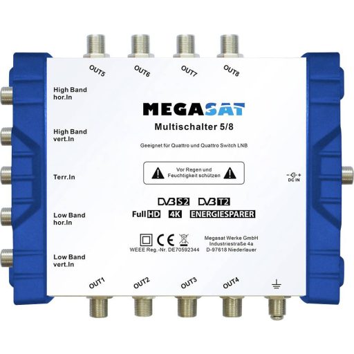 MegaSat 0600150 Sat multikapcsoló Bemenetek (multikapcsoló): 5 (4 SAT/1 terresztikus) Résztvevők száma: 8