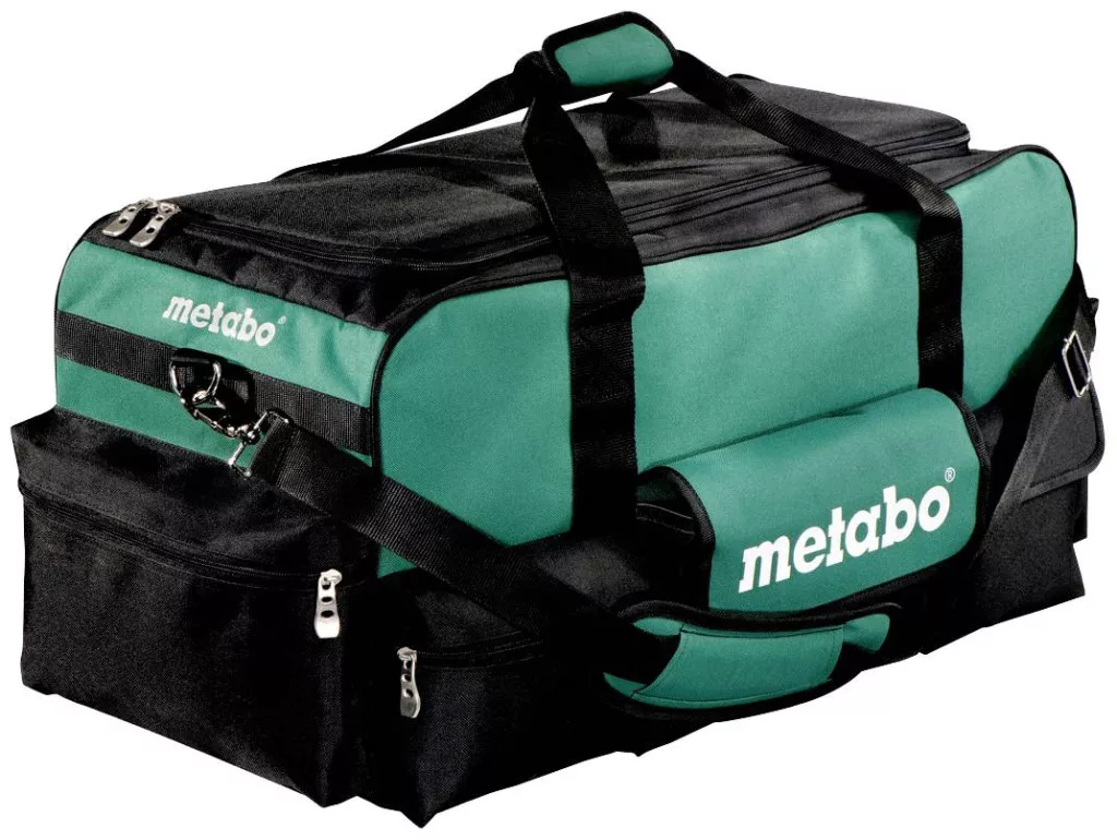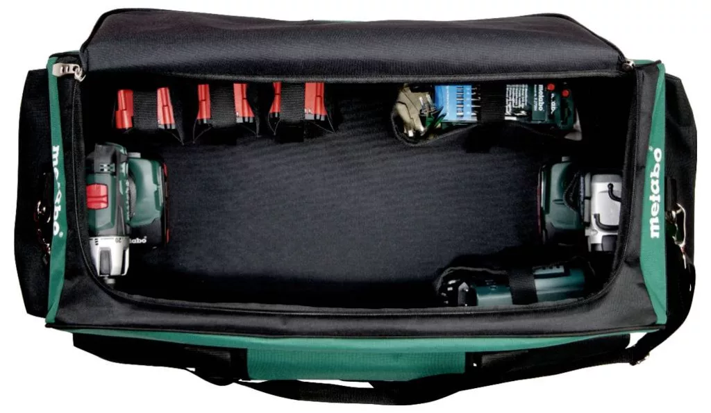 Equipment: A nagy, praktikus Metabo szerszámtáska · A táska belsejében öt rekesz található tépőzáras pántokkal három akkumulátorcsomag, egy töltő és tartozékok számára · Kívül két tágas cipzáros zseb és három másik kis zseb található a gyors hozzáférés érdekében · Kényelmes oldalpárnák és párnázott vállpánt · Három fényvisszaverő Metabo logó az optimális láthatóság érdekében az építkezésen