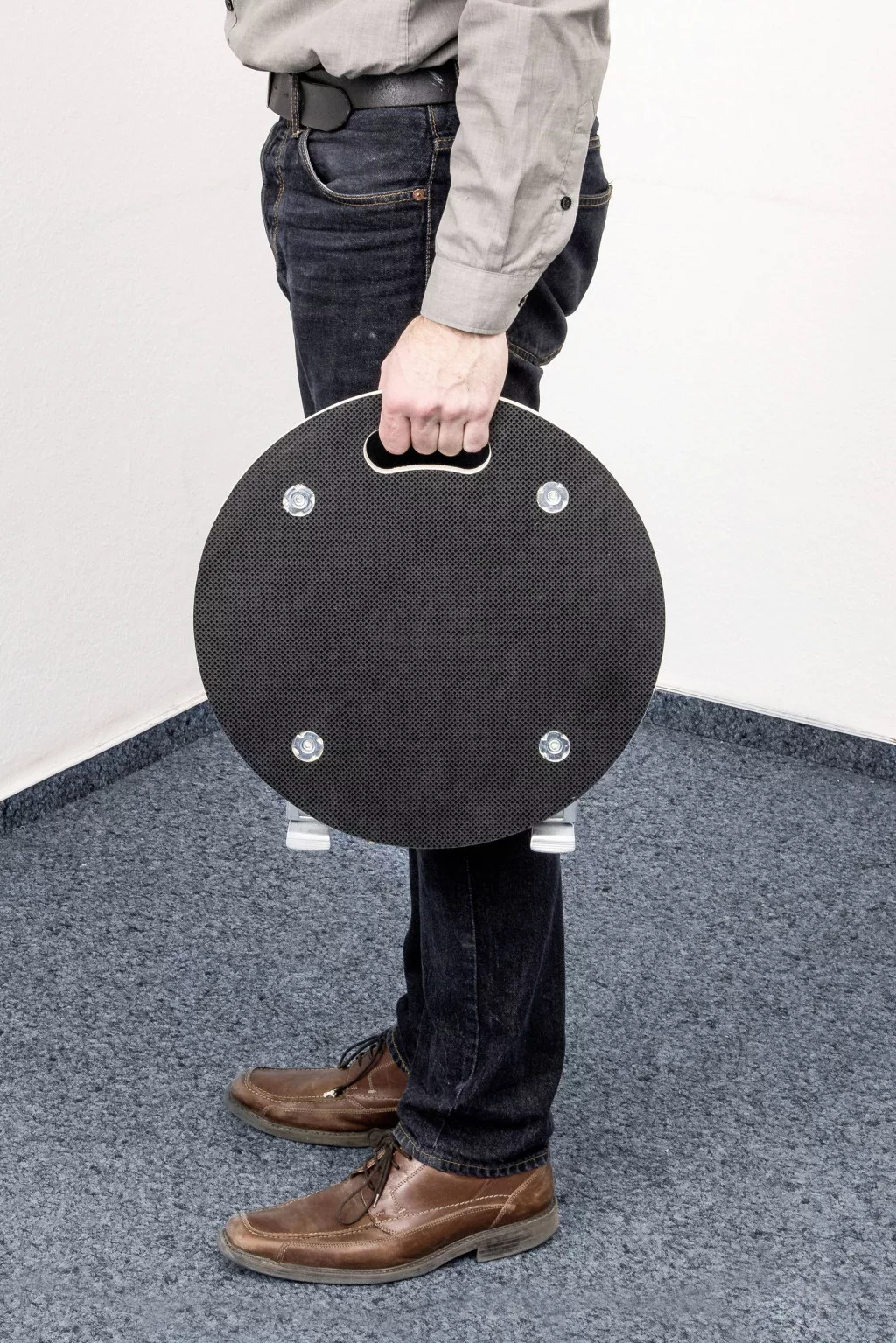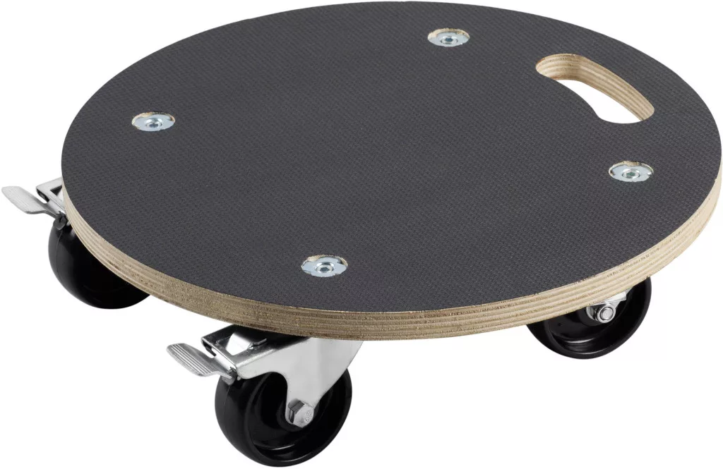 Jellemzők: Teherbírás (max.): 200 kg lemezméret: Ø 380 mm lemezvastagság: 18 mm teljes magasság: 110 mm kerék Ø: 75 mm anyaggörgő: poliamid (PA) anyaglemez: szitanyomás lemez kerekek száma: 4