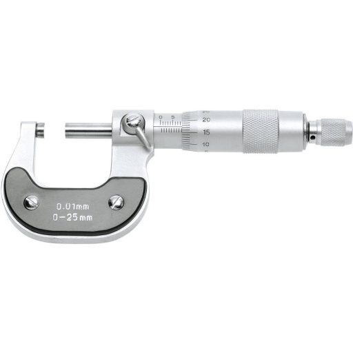 Műszaki adatok: ATT.NUM.DIAMETER_MEASURING_DRUM: 18 mm · Anyag: Keményfém · Anyagjellemző: Matt, krómozott · DIN szabvány: DIN 863-1 · Emelkedés: 0.5 mm · Kalibrált: ISO · Leolvasás: 0.01 mm · Mérési tartomány: 0 - 25 mm · Mérési tartomány (max.): 25 mm · Mérési tartomány (min.): 0 mm · Súly: 300 g · Típus (kategória): Mikrométer