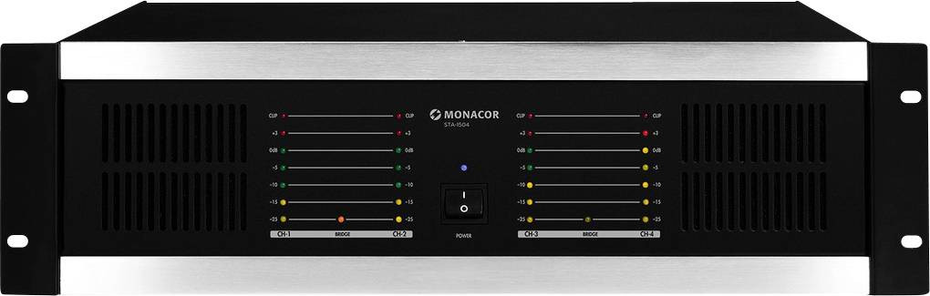 Monacor STA-1504 Nagy teljesítményű erősítő RMS teljesítmény kimeneti csatornánként 4 Ohm-nál: 160 W