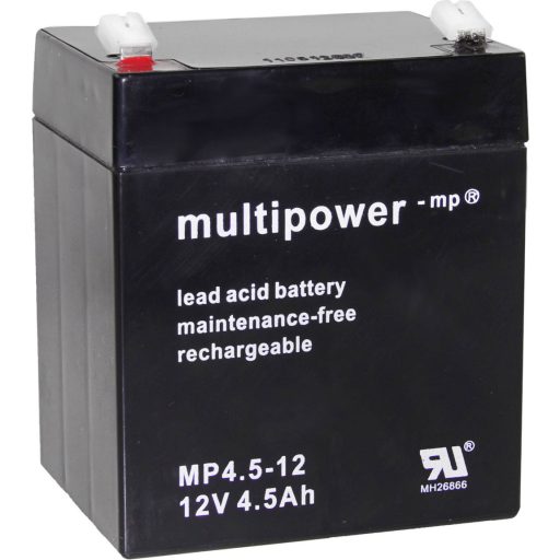 Műszaki adatok: Csatlakozó (akku): 4,8 mm-es laposérintkezős dugó · Elem jellemzők: Karbantartásmentes, Kis önkisülés · Elem-/akkutechnológia: Ólom-vlies (AGM) · Feszültség: 12 V · Kapacitás (mAh, Ah): 4.5 Ah · Méret, magasság: 107 mm · Méret, mélység: 70 mm · Méret, szélesség: 90 mm · Pólustípus: F1 · Súly: 1620 g · További műszaki adatok: Hőmérsékleti tartomány -15 és +50 ° C között · Újratölthető: Igen