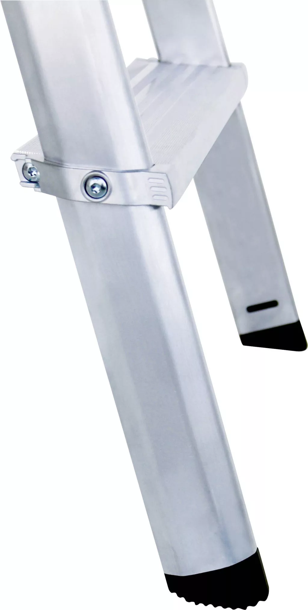 Alumínium lépcső létrák Ergonómikus alakú létracsavarok a könnyű kezelhetőség érdekében 80 mm mélyen, barázdált lépcsőn és nagy platformon Hat szintből kapható alumínium: szórásvédelem két nagy szilárdságú, hosszú szalaggal Lépések közötti távolság: 235 mm Létramagasság: 70 ° Maximális terhelés: 150 kg