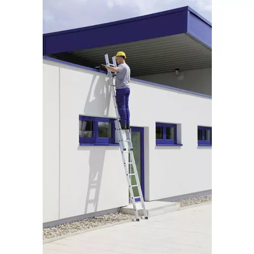 Alumíniumból készült létrahosszabbító létra Stabil téglalap alakú, cső alakú távtartó, mindkét oldalán hornyolt, négyirányú, rántott oszlop / Spar-csatlakozás 30 x 30 mm-es négyszögletes lengőkarral, egyszerű magasság-állítással a lépcsőről a lépcsőre. A felső létrához automatikusan reteszelő biztonsági szerkezettel ellátott dugaszoló kampóknak köszönhetően, 2 x 14 lépcsőfokból, fali görgőkkel, korrózióálló vezetőelemek Felső létra 3.0-ig m nivello® létracipővel. Felfüggesztési távolság: 280 mm Létra szélessége: 420 mm (keresztirány nélkül) Kapható mozgatással és anélkül Megjegyzés: A szabvány szerint a hosszabbító létraszakaszt nem lehet elválasztani a létrától 3,0 m feletti hosszúságon. Maximális terhelés: 150 kg