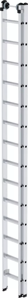 Alumíniumból készült létrahosszabbító létra Stabil téglalap alakú, cső alakú távtartó, mindkét oldalán hornyolt, négyirányú, rántott oszlop / Spar-csatlakozás 30 x 30 mm-es négyszögletes lengőkarral, egyszerű magasság-állítással a lépcsőről a lépcsőre. A felső létrához automatikusan reteszelő biztonsági szerkezettel ellátott dugaszoló kampóknak köszönhetően, 2 x 14 lépcsőfokból, fali görgőkkel, korrózióálló vezetőelemek Felső létra 3.0-ig m nivello® létracipővel. Felfüggesztési távolság: 280 mm Létra szélessége: 420 mm (keresztirány nélkül) Kapható mozgatással és anélkül Megjegyzés: A szabvány szerint a hosszabbító létraszakaszt nem lehet elválasztani a létrától 3,0 m feletti hosszúságon. Maximális terhelés: 150 kg