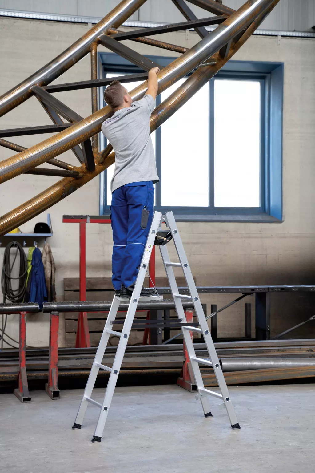 Alumíniumból készült létralépcsők Stabil téglalap alakú csövek Négyszögletes bordák 30 x 30 mm-rel, mindkét oldalán bordázva, 4-pontos karimás szár / csatlakozó csatlakozás Kúpos csapvezető a biztonságos állványhoz Tömör, horganyzott acél csuklópánt csavarkötéssel nivello® létracipő szabadalmaztatott 2 tengelyes döntési technológiával A szórógép felső oldala két nagy szilárdságú, hosszú hosszú hevederrel