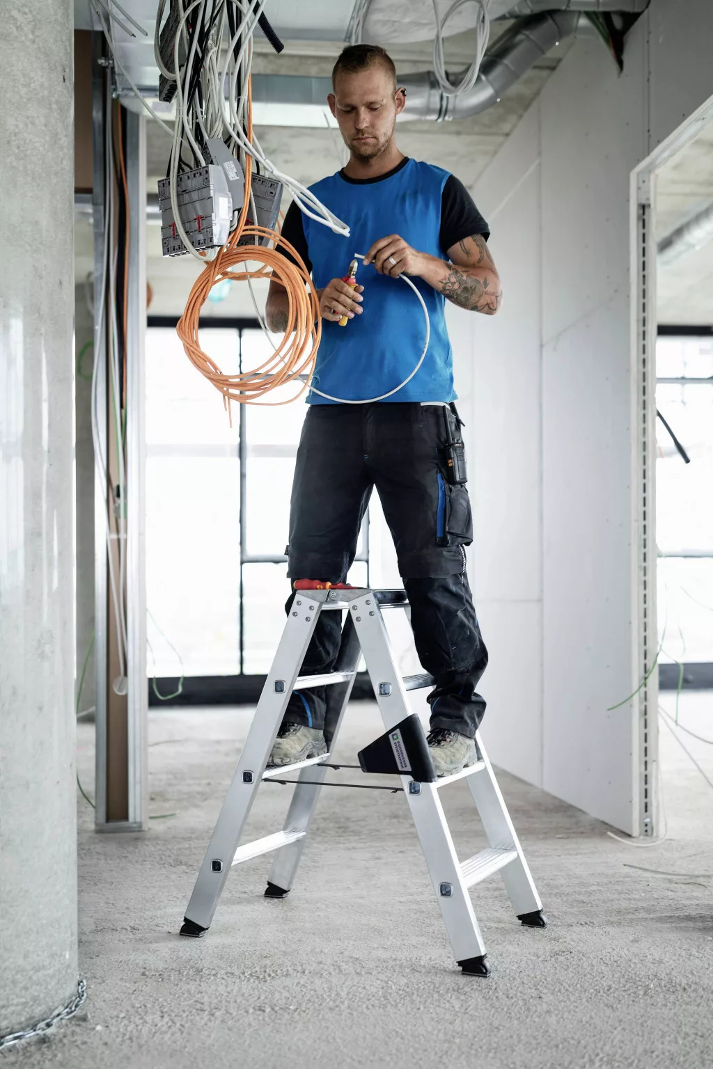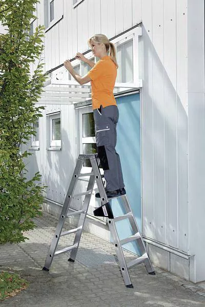 Alumíniumból készült lépcsőfokok Stabil téglalap alakú csövek, 80 mm mély, hullámos futófelületek 4-szeres karimás lépcsős / szikracsatlakozás Kúpos csavarvezető a biztonságos állványhoz 4-szeres csavarozással, szilárd létracsatlakozással, alumíniumból készült ergo-pad® fogózónával, szorító mechanizmussal, nivello® létra cipő szabadalmaztatva 2 tengelyes dőléstechnika Szétterjedés elleni védelem két nagy szilárdságú, hosszú szalaggal Lépéstávolság: 235 mm Létra dőlése: 70 ° Lépcsőfokokkal és anélkül kapható. Maximális terhelés: 150 kg