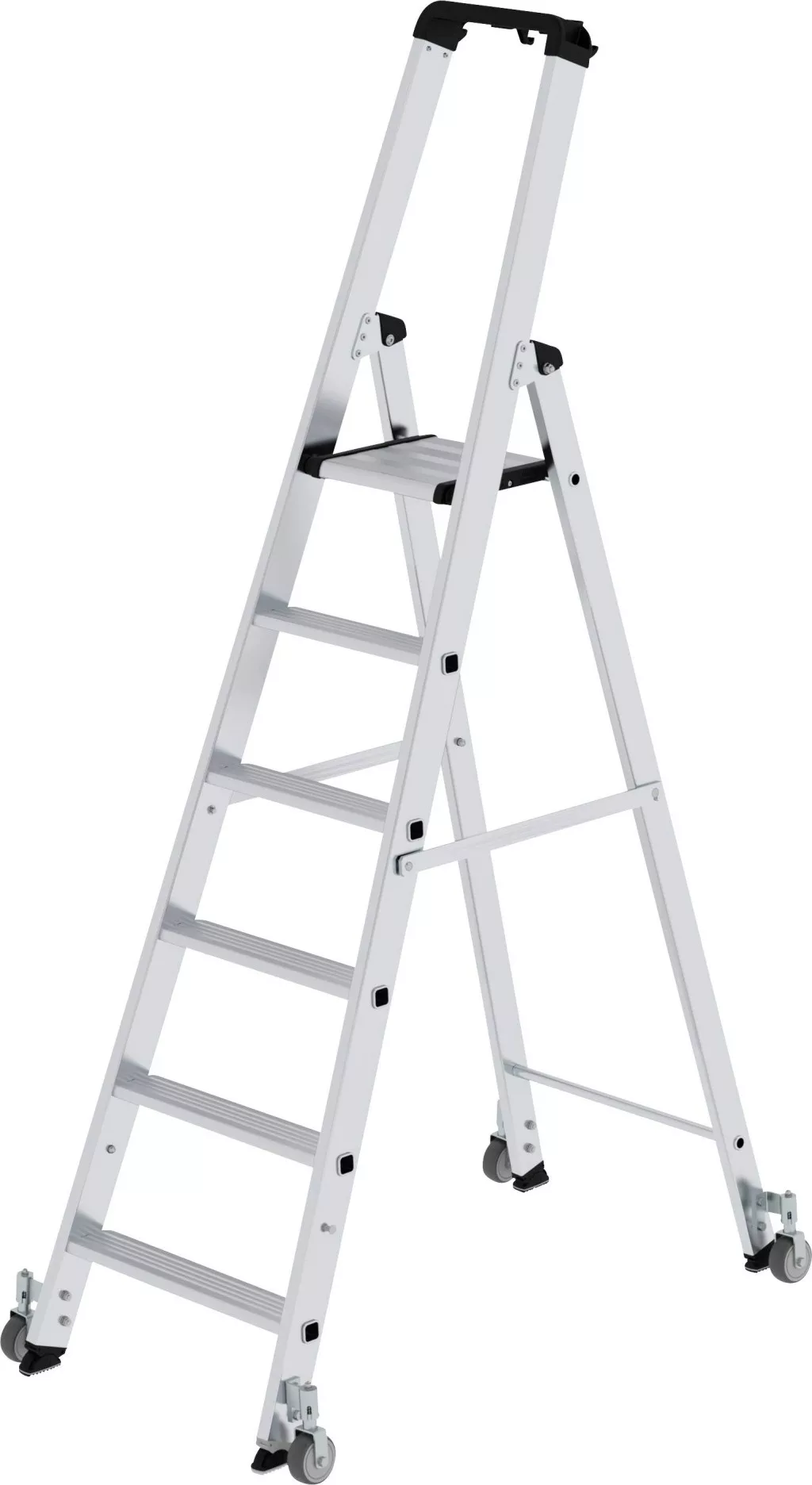 Alumíniumból készült lépcsőépítők Stabil, téglalap alakú csővezetékek, 80 mm mély, hullámos lépcsők és nagy platform 4-szeres karimás lépcsős / szikracsatlakozás Kúpos tengelyvezető egy biztonságos állványhoz Négy önzáró rugógörgő (Ø 80 mm) Merev csatlakozás a mindkét oldalról leválasztható fém rugóknak köszönhetően Hét lépésről: szórófej védelem két nagy szilárdságú gyöngyszíjjal. Lépcsőcsatlakozással ellátott nivello® létracipő szabadalmaztatott 2 tengelyes lejtős technológiával