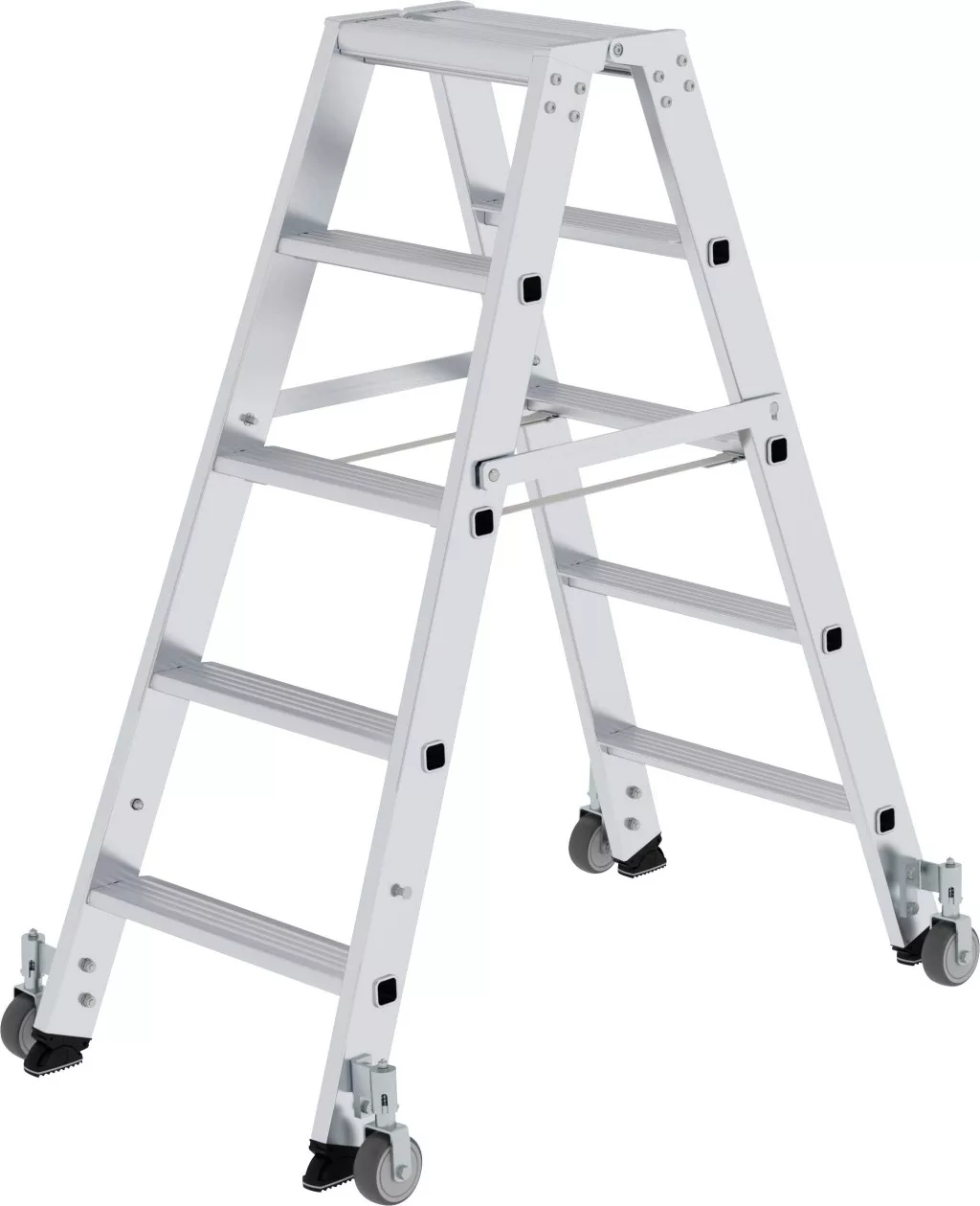 Lépcsős létra alumíniumból Stabil, téglalap alakú csőtartók, 80 mm mély, hullámos futófelületek 4-szeres karimás lépcsős / szikracsatlakozás Kúpos csavarvezető a biztonságos állványhoz Négy önzáró rugógörgő (Ø 80 mm) Merev csatlakozás a mindkét oldalán leválasztható fém rugókkal Alumínium nivello® létracipő szabadalmaztatott 2 tengelyes dőléstechnikával Lépcső távolsága: 235 mm Létra dőlése: 70 ° Maximális terhelés: 150 kg