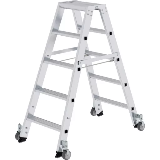 Műszaki adatok: Anyag: Alumínium · Fokok/szintek száma: 10 · Fokozatok: 235 mm · Görgő Ø: 80 mm · Kivitel: Mindkét oldalon hozzáférhető görgőkkel, szabadon álló · Munkamagasság (max.): 2.75 m · Méret, magasság: 1.16 m · Terhelés (max.): 150 kg · További műszaki adatok: Külső tesztigazolás: 2228711KAU-005a: 2017-11-23 Lépés hossza: 1,03 m · Alsó külső szélesség: 0,64 m