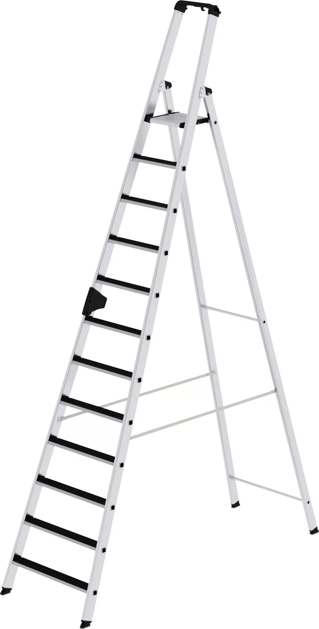 Lépcsőlépcső alumíniumból Stabil, téglalap alakú, 80 mm mély, hullámos lépcsőkkel és nagy platform négyszögletes karimás lépcső / Spar csatlakozással Kúpos szerszámvezető a biztonságos állványhoz 2 tengelyes lejtős technológia Praktikus tárolótálca beépített kampókkal és szerszámtartókkal Hét szintből: szórásvédelem két nagy szilárdságú, hosszú hevederes lépcső közötti távolság: 235 mm Létra dőlésszög: 70 ° Lépcsőfokokkal és anélkül is elérhető Maximális terhelés: 150 kg