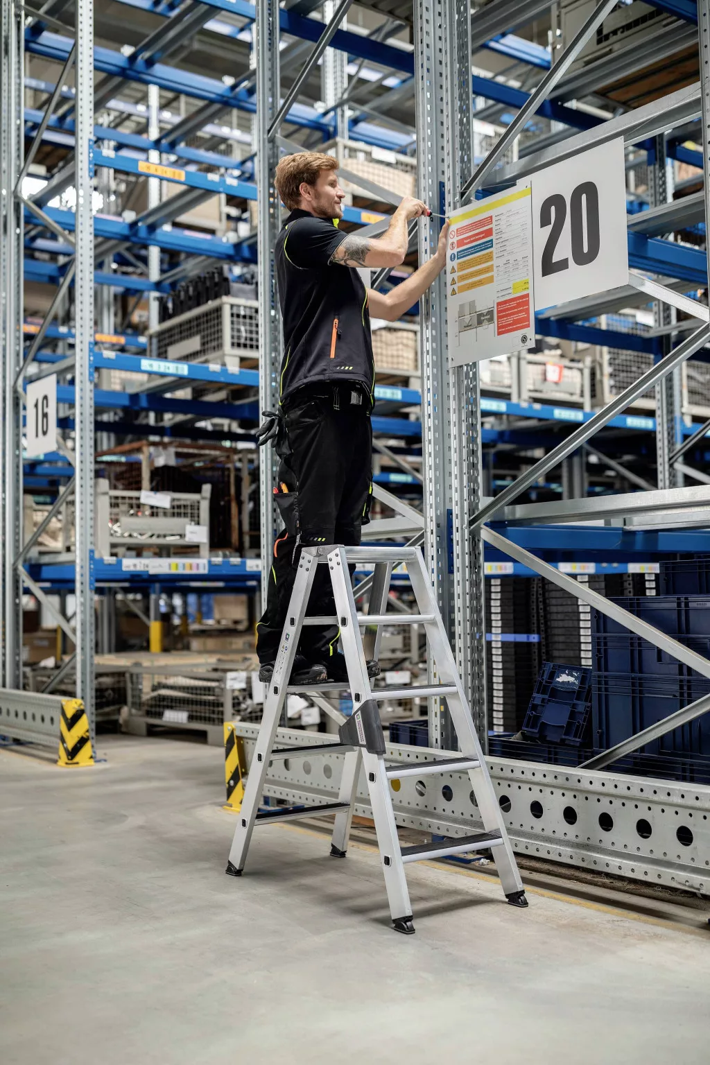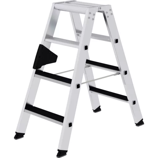 Műszaki adatok: Anyag: Alumínium · Fokok/szintek száma: 8 · Fokozatok: 235 mm · Kivitel: Szabadon álló, mindkét oldalról elérhető · Munkamagasság (max.): 2.5 m · Méret, magasság: 0.93 m · Terhelés (max.): 150 kg · További műszaki adatok: Külső tesztigazolás: 2228711KAU-005a: 2017-11-23 · Lépéshossz: 0,86 m · Alsó külső szélesség: 0,46 m
