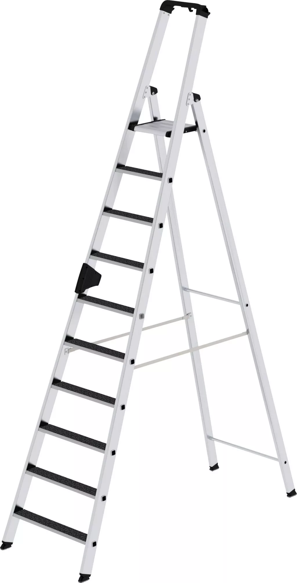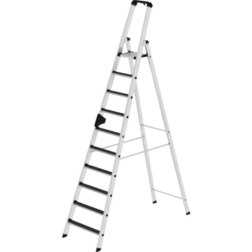 Lépcsőlépcső alumíniumból Stabil, téglalap alakú, 80 mm mély, hullámos lépcsőkkel és nagy platform négyszögletes karimás lépcső / Spar csatlakozással Kúpos szerszámvezető a biztonságos állványhoz 2 tengelyes lejtős technológia Praktikus tárolótálca beépített kampókkal és szerszámtartókkal Hét szintből: szórásvédelem két nagy szilárdságú, hosszú hevederes lépcső közötti távolság: 235 mm Létra dőlésszög: 70 ° Lépcsőfokokkal és anélkül is elérhető Maximális terhelés: 150 kg