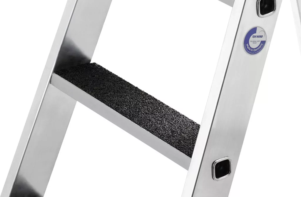 Alumíniumból készült lépcsőfokok Stabil téglalap alakú csövek, 80 mm mély, hullámos futófelületek 4-szeres karimás lépcsős / szikracsatlakozás Kúpos csavarvezető a biztonságos állványhoz 4-szeres csavarozással, szilárd létracsatlakozással, alumíniumból készült ergo-pad® fogózónával, szorító mechanizmussal, nivello® létra cipő szabadalmaztatva 2 tengelyes dőléstechnika Szétterjedés elleni védelem két nagy szilárdságú, hosszú szalaggal Lépéstávolság: 235 mm Létra dőlése: 70 ° Lépcsőfokokkal és anélkül kapható. Maximális terhelés: 150 kg
