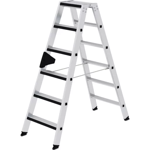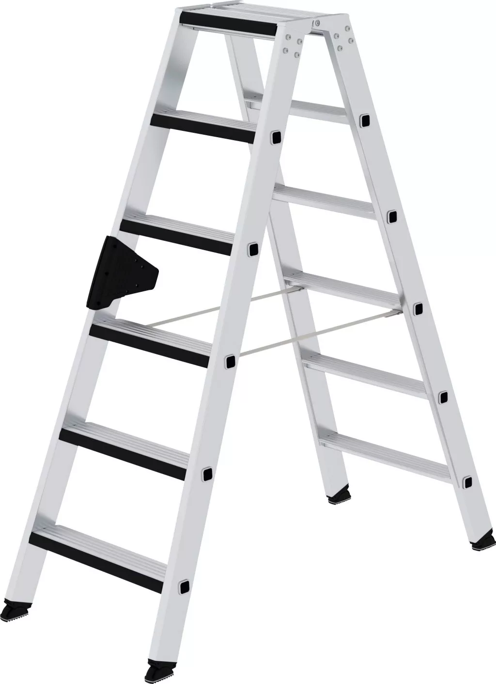 Alumíniumból készült lépcsős létra Stabil négyszögletes csőcsonkok, 80 mm mély, hullámosított lépcsők 4-szeresen préselt lépcső / tartócsatlakozás Kúpos tolóvezető a biztonságos állványhoz 4-szeres csavarozott, szilárd létracsatlakozás alumíniumból, relax-step® lépésbélésből, kényelmes állványhoz nivello® létracipő szabadalmaztatott 2 tengelyes döntési technológiával