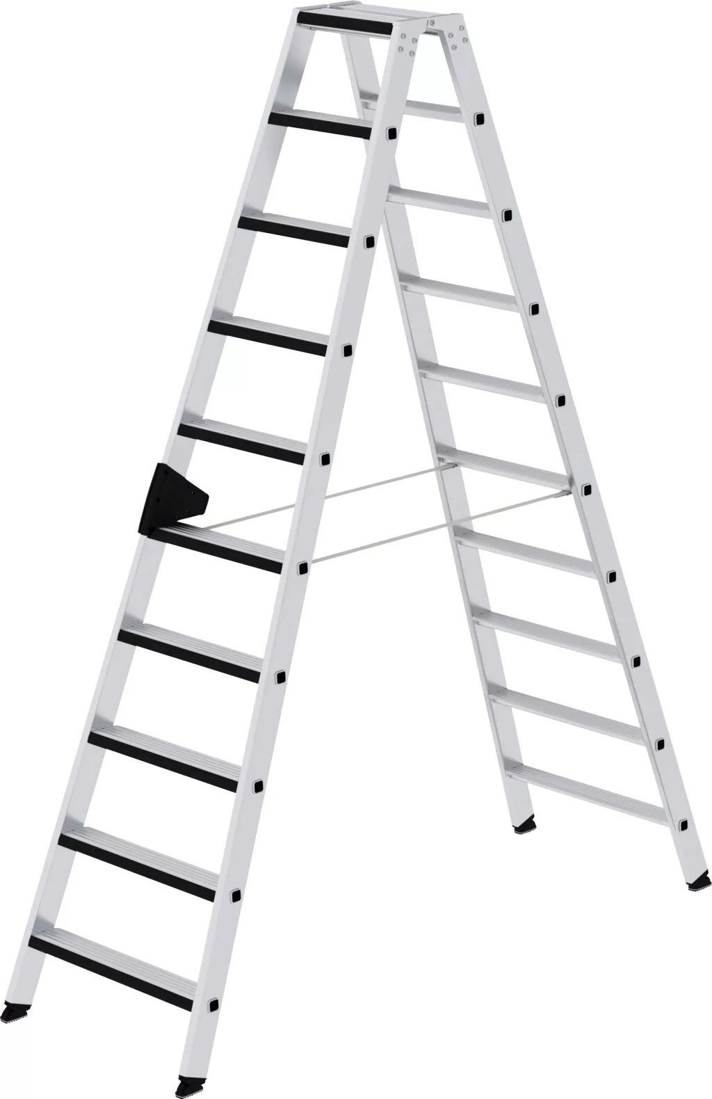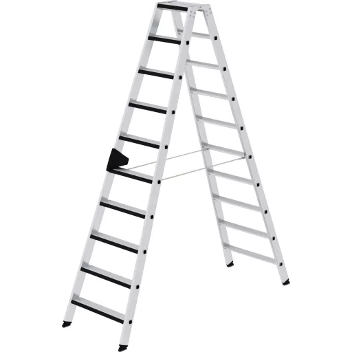 Alumíniumból készült lépcsős létra Stabil négyszögletes csőcsonkok, 80 mm mély, hullámosított lépcsők 4-szeresen préselt lépcső / tartócsatlakozás Kúpos tolóvezető a biztonságos állványhoz 4-szeres csavarozott, szilárd létracsatlakozás alumíniumból, relax-step® lépésbélésből, kényelmes állványhoz nivello® létracipő szabadalmaztatott 2 tengelyes döntési technológiával