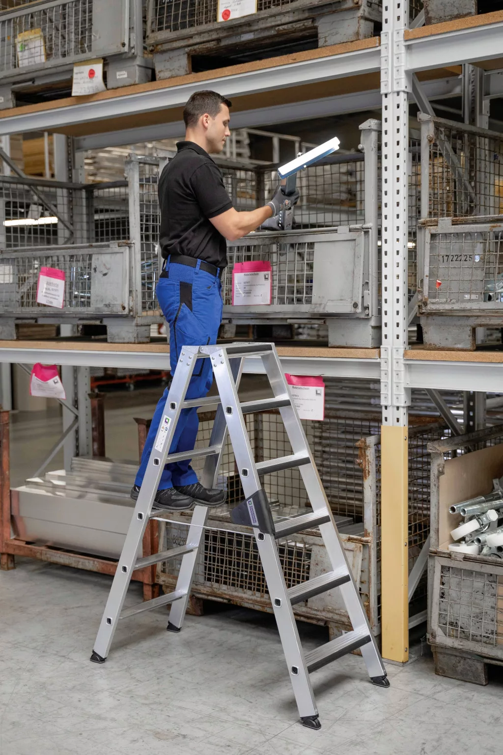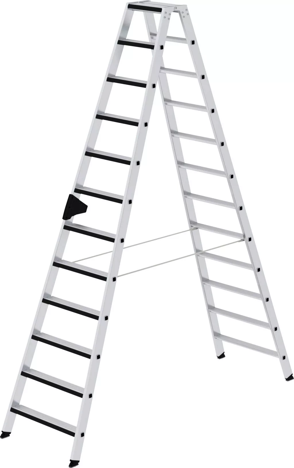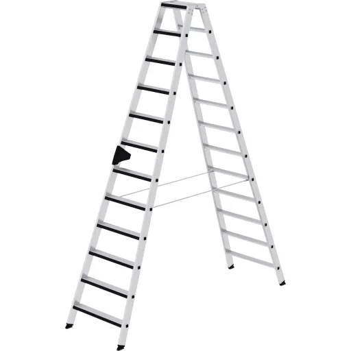 Alumíniumból készült lépcsős létra Stabil négyszögletes csőcsonkok, 80 mm mély, hullámosított lépcsők 4-szeresen préselt lépcső / tartócsatlakozás Kúpos tolóvezető a biztonságos állványhoz 4-szeres csavarozott, szilárd létracsatlakozás alumíniumból, relax-step® lépésbélésből, kényelmes állványhoz nivello® létracipő szabadalmaztatott 2 tengelyes döntési technológiával
