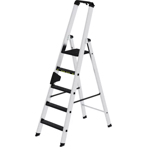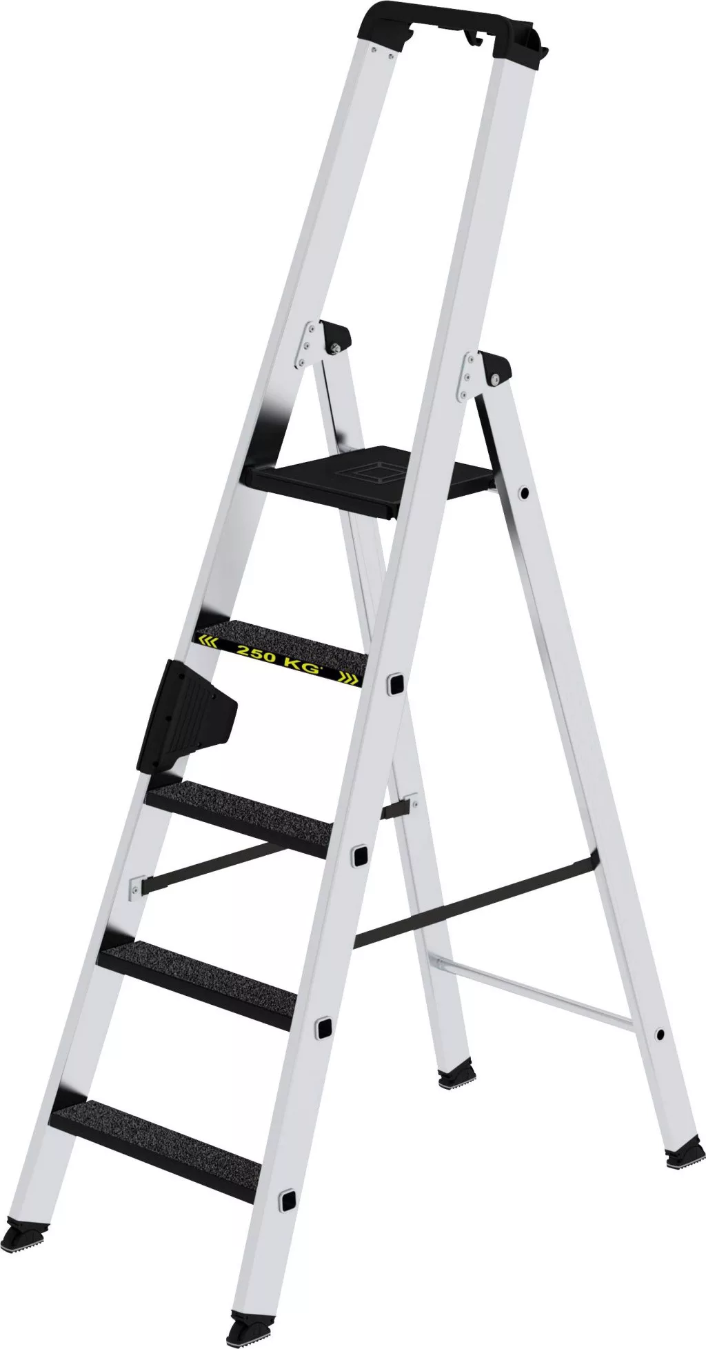Lépcsős létra alumíniumból Stabil, téglalap alakú, 80 mm mély, hullámos lépcsőfokok és nagy platformos lépcsőfokozat R 13-as rögzítőcsiga a tanúsított csúszásállósághoz 4-szeres karimás lépcső / Spar csatlakozás Kúpos csapvezető a biztonságos állványhoz „biztonságos sapka” ergo-pad® Fogózóna rögzítő mechanizmussal nivello® létracipő szabadalmaztatott 2 tengelyes lejtős technológiával. Praktikus tárolótálca beépített kampókkal és szerszámtartókkal Öt szintből: Terjedésvédelem két nagy szilárdságú, hosszú hevederrel Lépési távolság: 235 mm Létramagasság: 70 ° Maximális terhelés: 250 kg